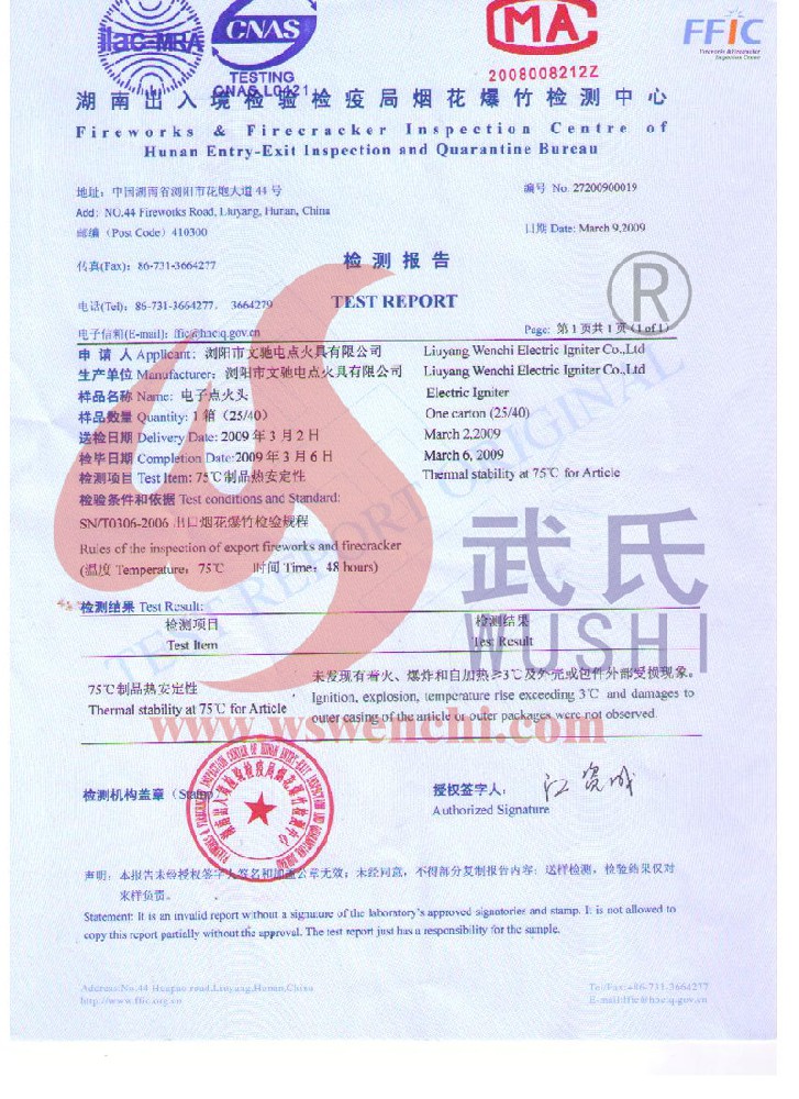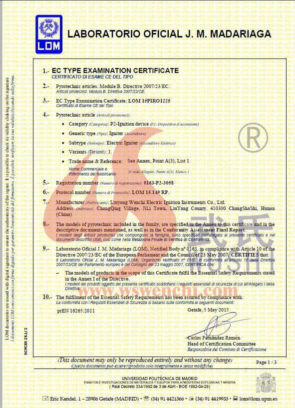 瀏陽市文馳電點(diǎn)火具有限公司(原培文電子點(diǎn)火器材廠),創(chuàng)建于1998年,是一家專業(yè)從事研制銷售電子點(diǎn)火產(chǎn)品的民營科技企業(yè),是我國第1枚煙花用電點(diǎn)火頭生產(chǎn)者,是《煙花爆竹電點(diǎn)火頭國標(biāo)》牽頭起草單位。公司位于中國“煙花之鄉(xiāng)”湖南省瀏陽市,地理位置優(yōu)越,交通便利?! ? 我公司研制的對象是用電能引燃火藥、做機(jī)械功等預(yù)定功能的一次性使用的元件或裝置,包括電點(diǎn)火頭(英文名ElectricMatch or Electric Igniter,中文俗稱“電火柴”或“電發(fā)火頭”)、電點(diǎn)火管和延期電點(diǎn)火管;我們估且在以后的產(chǎn)品技術(shù)欄中將我們研究的產(chǎn)品統(tǒng)稱為電點(diǎn)火具,將電點(diǎn)火器看成是用于提供和控制供給電點(diǎn)火元件點(diǎn)火的電能器材;我們研究的電點(diǎn)火橋路有橋絲式、無橋絲···